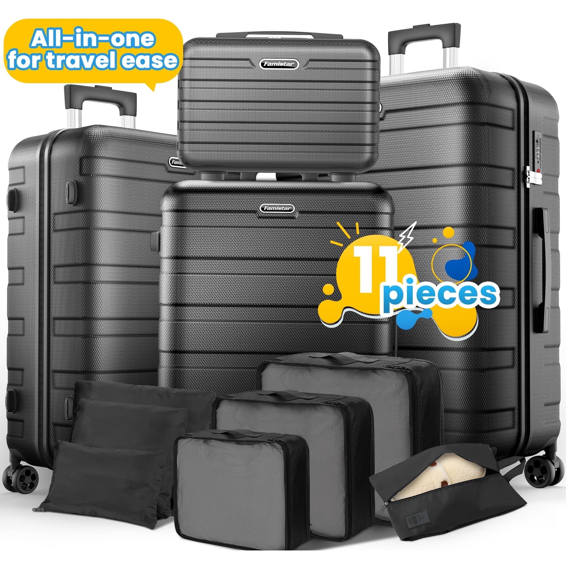 11Pcs Hardshell Luggage Set, Lightweight Suitcases w/ Spinner Wheels, Carry on Luggage, Black, UPC: 735280601813