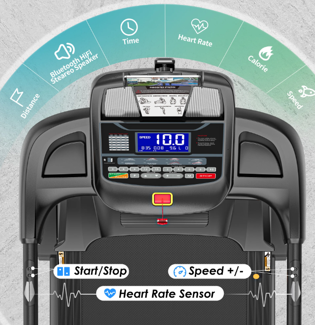 - 【Smart Handrail & Multi-Functional Console】Easily track your progress with built-in handrail sensors that monitor heart rate and body fat percentage. The user-friendly panel features quick-adjustment buttons, Bluetooth connectivity for app integration, and convenient storage for your water bottle, phone, or tablet, ensuring a seamless workout experience.